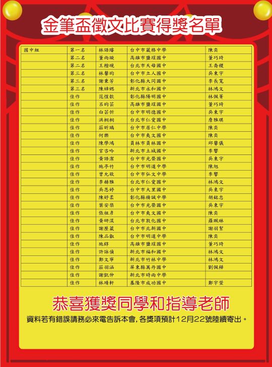 (競賽)2025金筆盃作文大賽得獎名單國中組